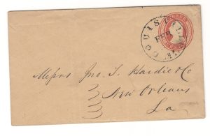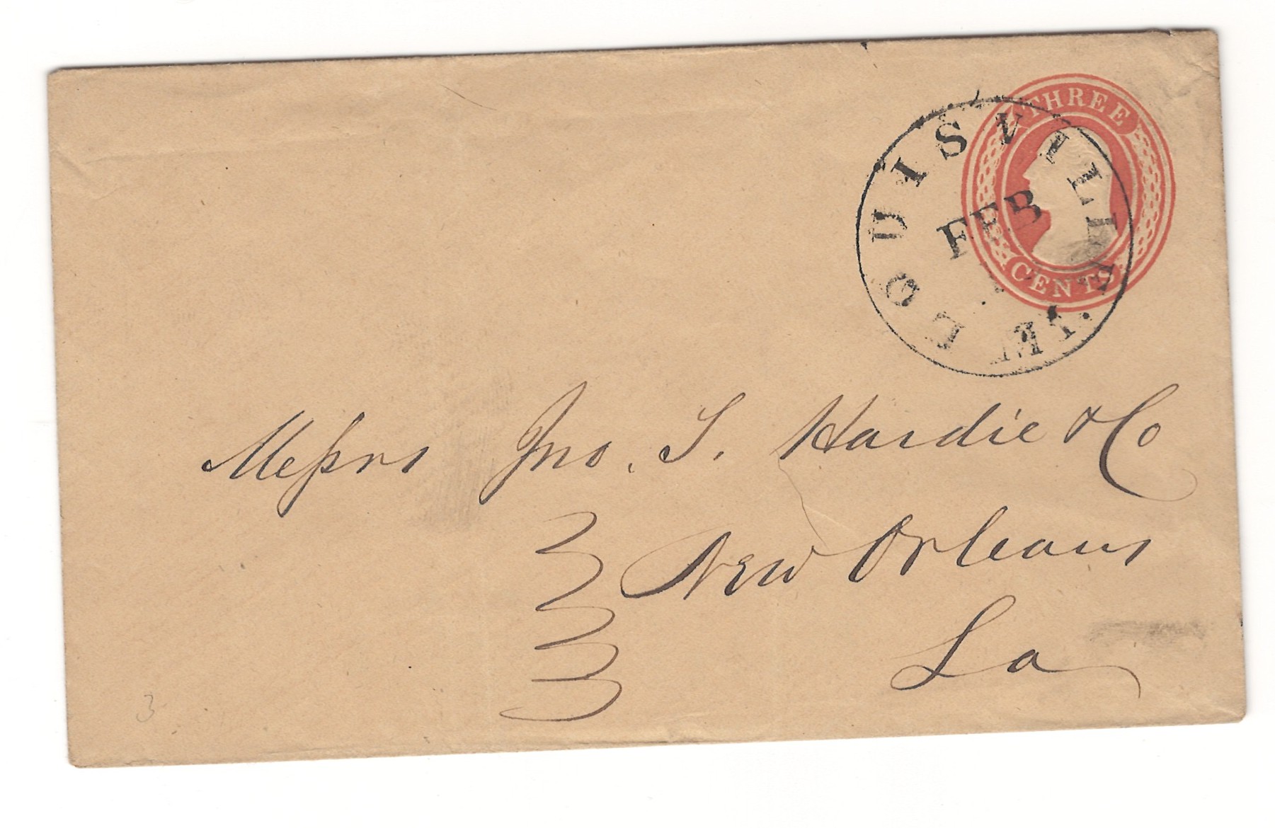 My cover this week is from Louisville, Mississippi. When I bid on this it was listed as Louisville, Kentucky. I could clearly see that the state started with an "M". A little research told me that there have been 41 Louisville post offices in the U.S. Of those and in the time period of this cover only three states started with an M. They are Minnesota, Mississippi and Missouri. Although the second letter in the state is hard to read it was easy to eliminate Missouri as all of the covers with the state name abbreviated for Missouri would have been MO. That left Minnesota which would have been M.T. and Mississippi which was Mi. I was trying to see a T as hard as I could. A little more research told me that there are no known Louisville, Minnesota covers known from Minnesota territory and if one does exist it would most likely be with a manuscript cancel. I have to concede that this is most likely Mississippi.