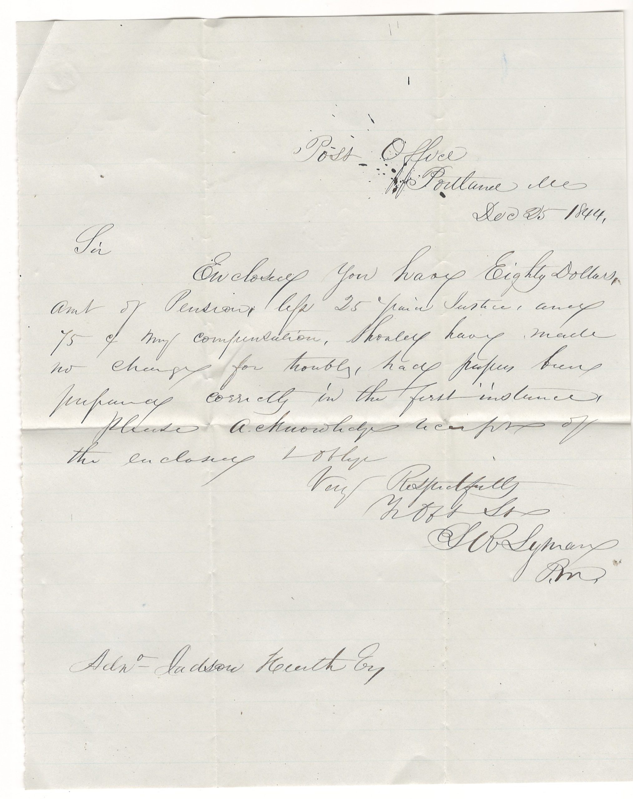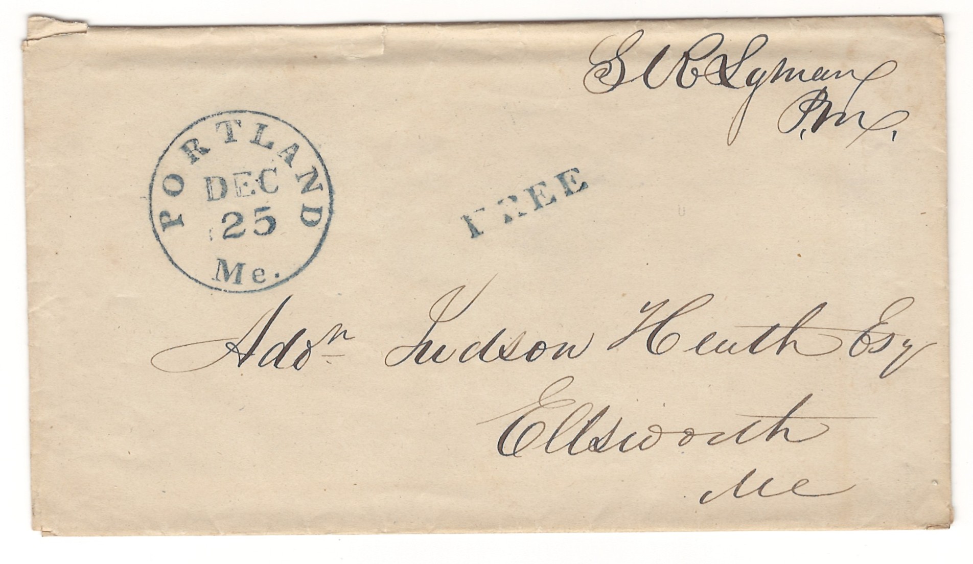 My cover this week was cancelled on Christmas Day 1844. It received free franking service and it was sent by the postmaster from Portland, Maine, Mr. Sylvanus R. Lyman to Mr. Hudson Heath in Ellsworth, Maine. Mr. Lyman was the postmaster for the Portland Post Office from May 4, 1841, through April 1, 1845. The letter enclosed has to do with Eighty dollars and some confusion over compensation having something to do with a pension. It's a confusing letter and I can't make out all the words, so I may not have that correct. I have also attached the letter. If you can make more sense of this, please let me know and I will update in a future post. |