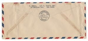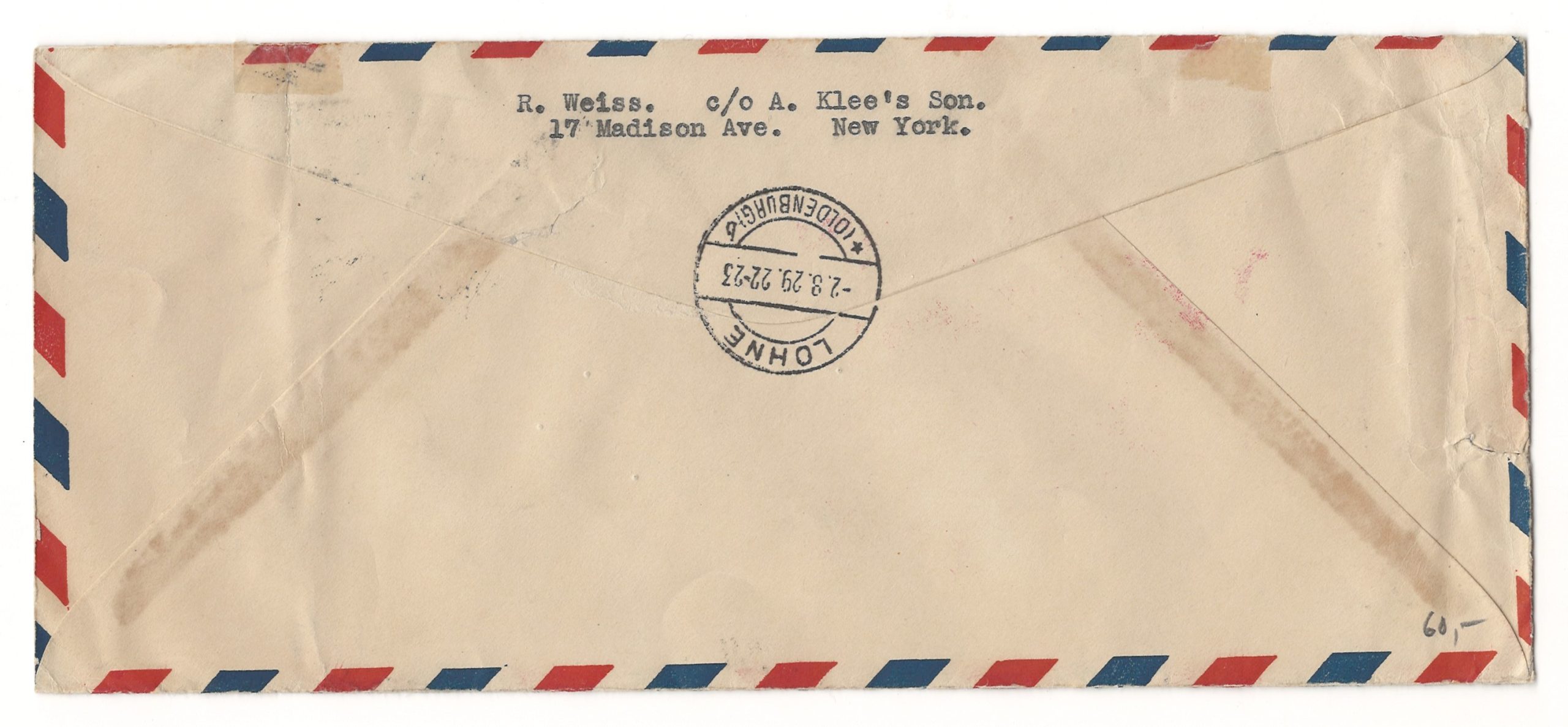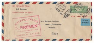 Today's cover is an early Catapult, (Katapultflug) Mail cover. The first trip was from Germany to New York on July 22, 1929. This letter was sent on the return trip back to Germany. (France did have earlier catapult service on a smaller scale.) The service was to speed up Trans-Atlantic mail. Catapult mail was replaced by the Zeppelin airmail service which in turn ended after the crash of the Hindenburg and the fact that other reliable aircraft had been developed capable of crossing the Atlantic. This letter started in New York on July 26, 1929, and was sent on the ship the S/S Bremen, one of two ships that were utilized for catapult mail. The other ship was the S/S Europa. The mail spent the majority of its trip at sea on the ship. When within a few hundred miles of shore it was sent by plane launched or catapulted from the ship for the remainder of the journey. The flight of that plane for this trip was 4-1/2 hours. The plane landed in Bremerhaven. All 18,000 pieces of letter express mail cargo were then loaded onto another plane for delivery in Berlin that afternoon. The trip from New York to Berlin took 5-1/2 days, which was about two days less than delivery by ship alone. The mail was then distributed to their final destinations which in this case was Oldenburg. That part of the trip was likely by train. The seller that sold me this claimed it was a registered cover, but registered service was not offered on catapult mail until 1931. All mail from the first two catapult flights received control numbers. The number 6591 on the front is that control number for this letter, not a registration number. The rate was twenty cents.