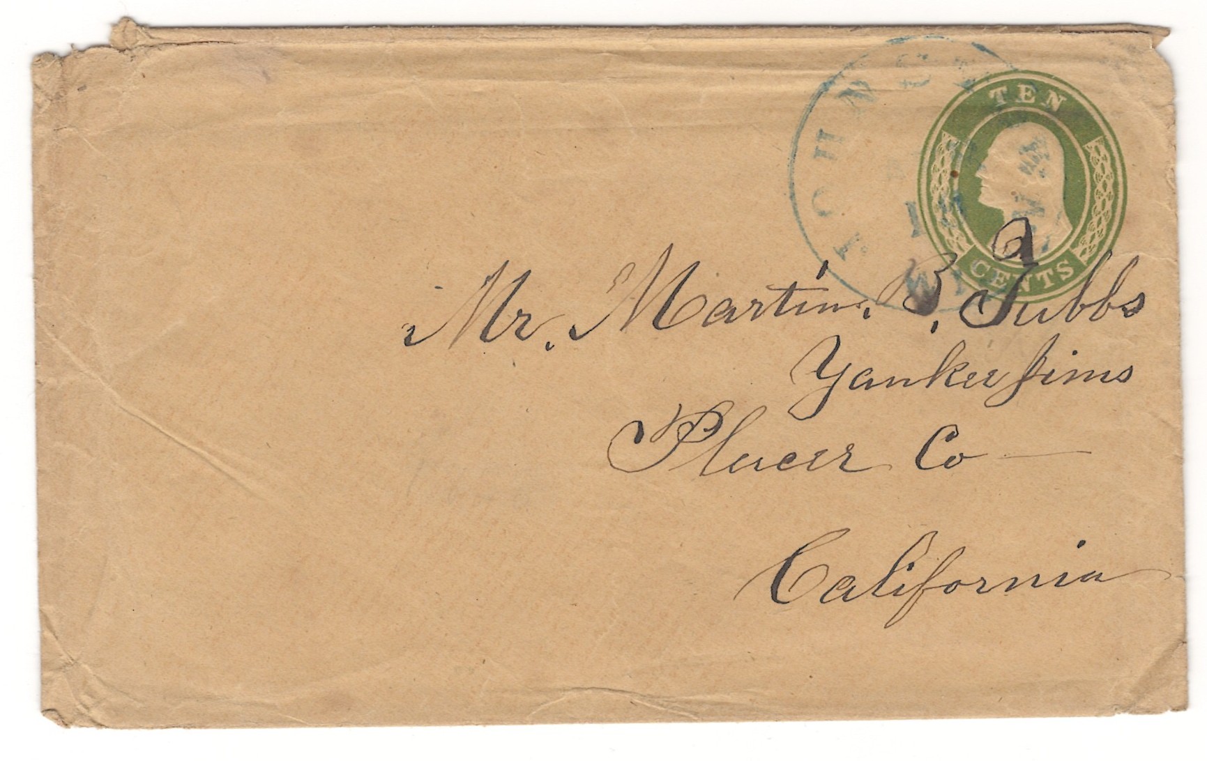My cover this week is postmarked in Johnstown, Wisconsin which was in Rock County and had an operating post office from 1839 to 1902. It was sent to the town of Yankee Jim's, California which was in Placer County and had non continuous service from 1852 to 1940. The two-page double sided letter was between brothers and was written on April 18, 1858, and describes farm life in Wisconsin. Whenever I find a ten cent Nesbitt postal stationary cover it is either to or from California.