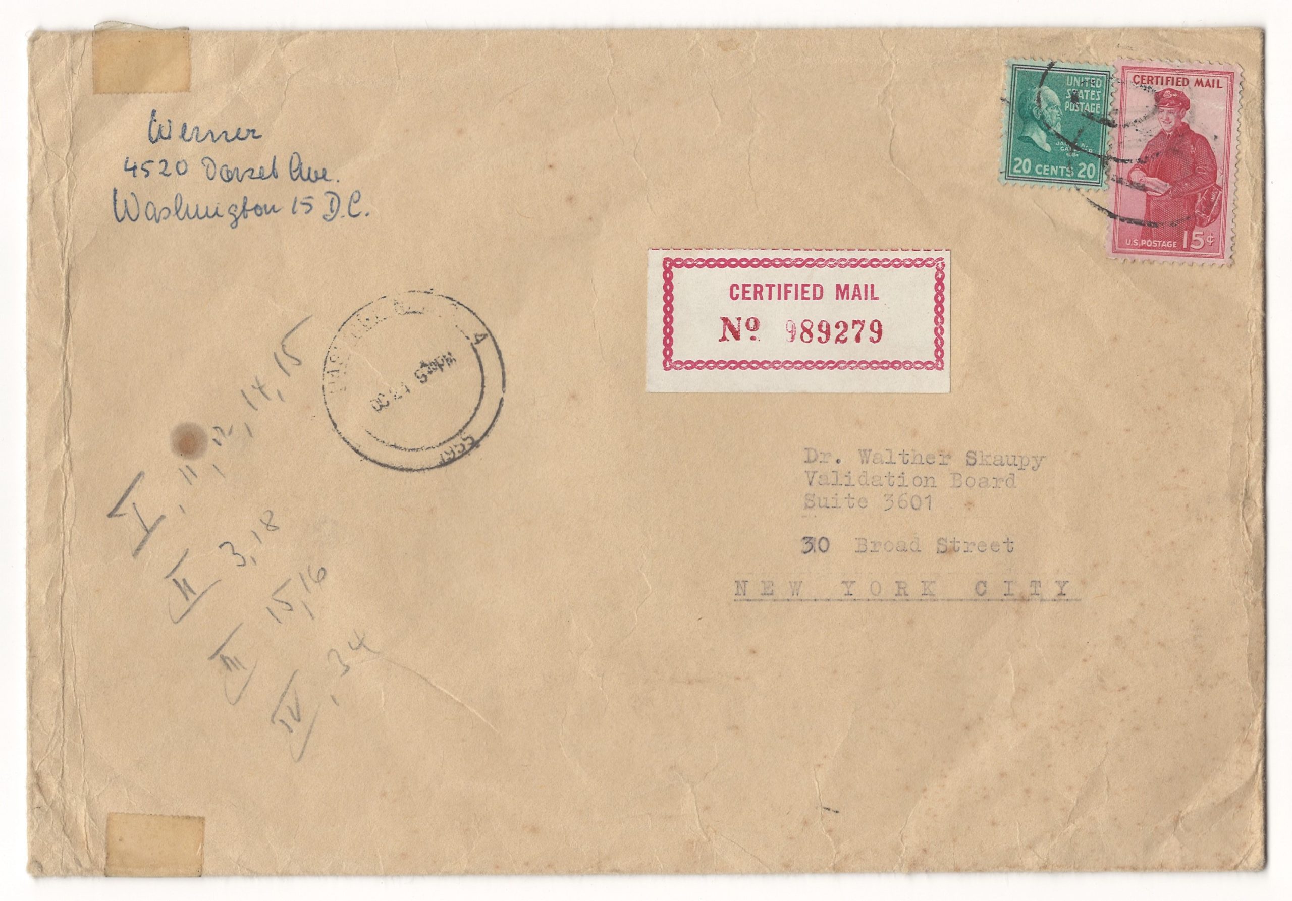 My cover this week is a large, certified cover sent on October 21, 1955. The contents were a long letter written in German and a newspaper article from the Washington Post from October 11, 1955, on a German Art Exhibit. Both of those are too large for me to scan. |