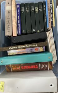 | We received four large boxes/totes of books last week. They will be cataloged and added to our inventory soon. Many of these books are titles that we did not currently have and most of these are out of print. There are two that I have been looking for several years. This is a reminder that if you have not been to the library recently, we are always expanding and improving. Please visit and support our library. |